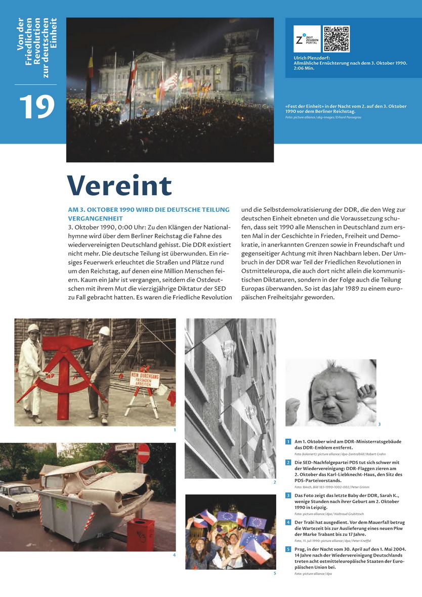 Diese Ausstellung erinnert an den Protest gegen die Fälschung der DDR-Kommunalwahlen, an die Fluchtbewegung im Sommer und die Massen-proteste im Herbst, die die SED-Diktatur in die Knie zwangen. Sie berichtet von der Selbstdemokratisierung der DDR, der deutsch-deutschen Solidarität und den außenpolitischen Weichenstellungen bis zur Wiedererlangung der deutschen Einheit. Auf 20 Tafeln können die Besucher über 100 zeithistorische Fotos und Dokumente betrachten, können sich erinnern oder neu entdecken. QR-Codes verlinken zu 18 Videointerviews mit Akteurinnen und Akteuren der Friedlichen Revolution, die auf https://zeitzeugen-portal.de zu finden sind.