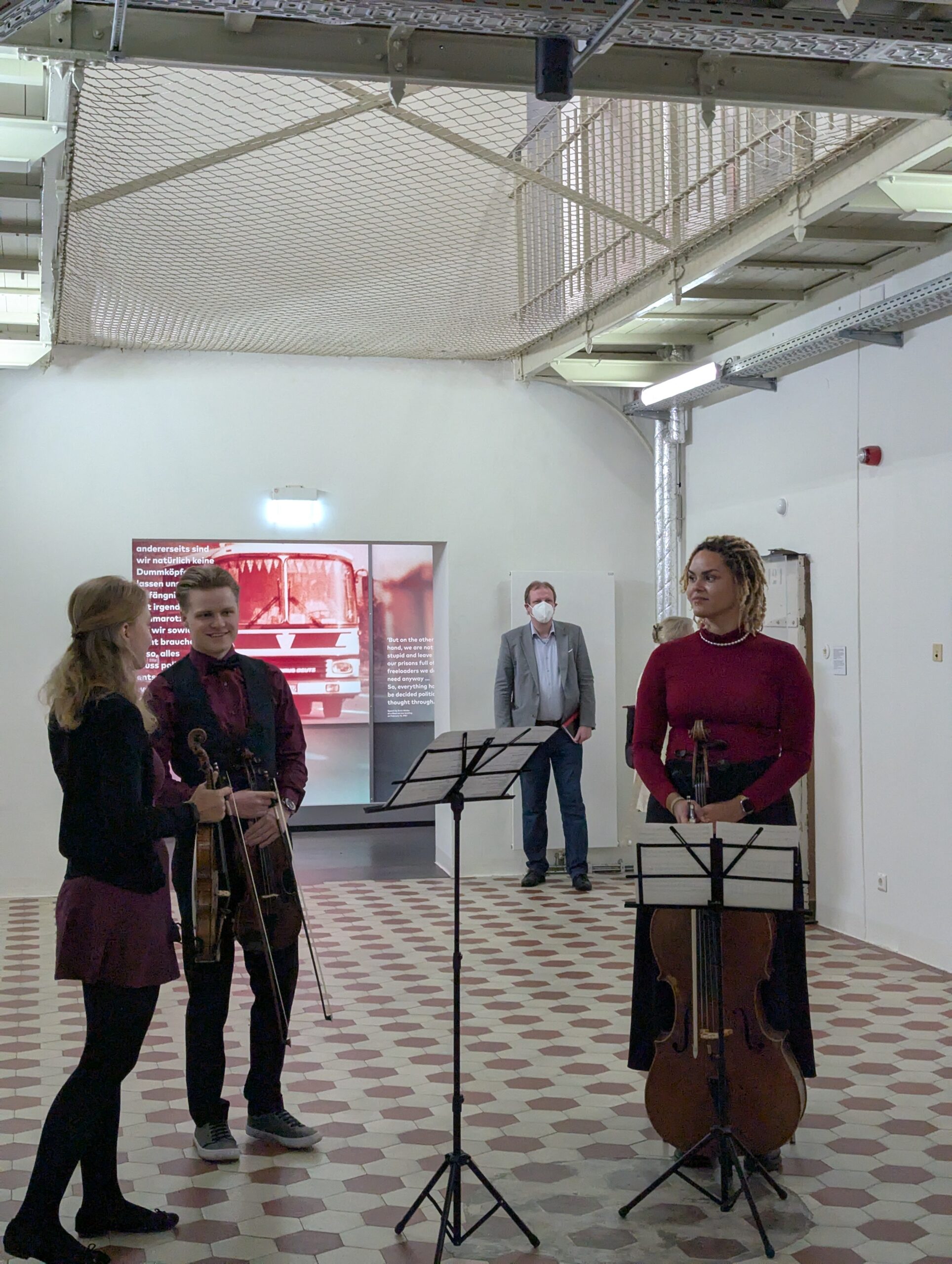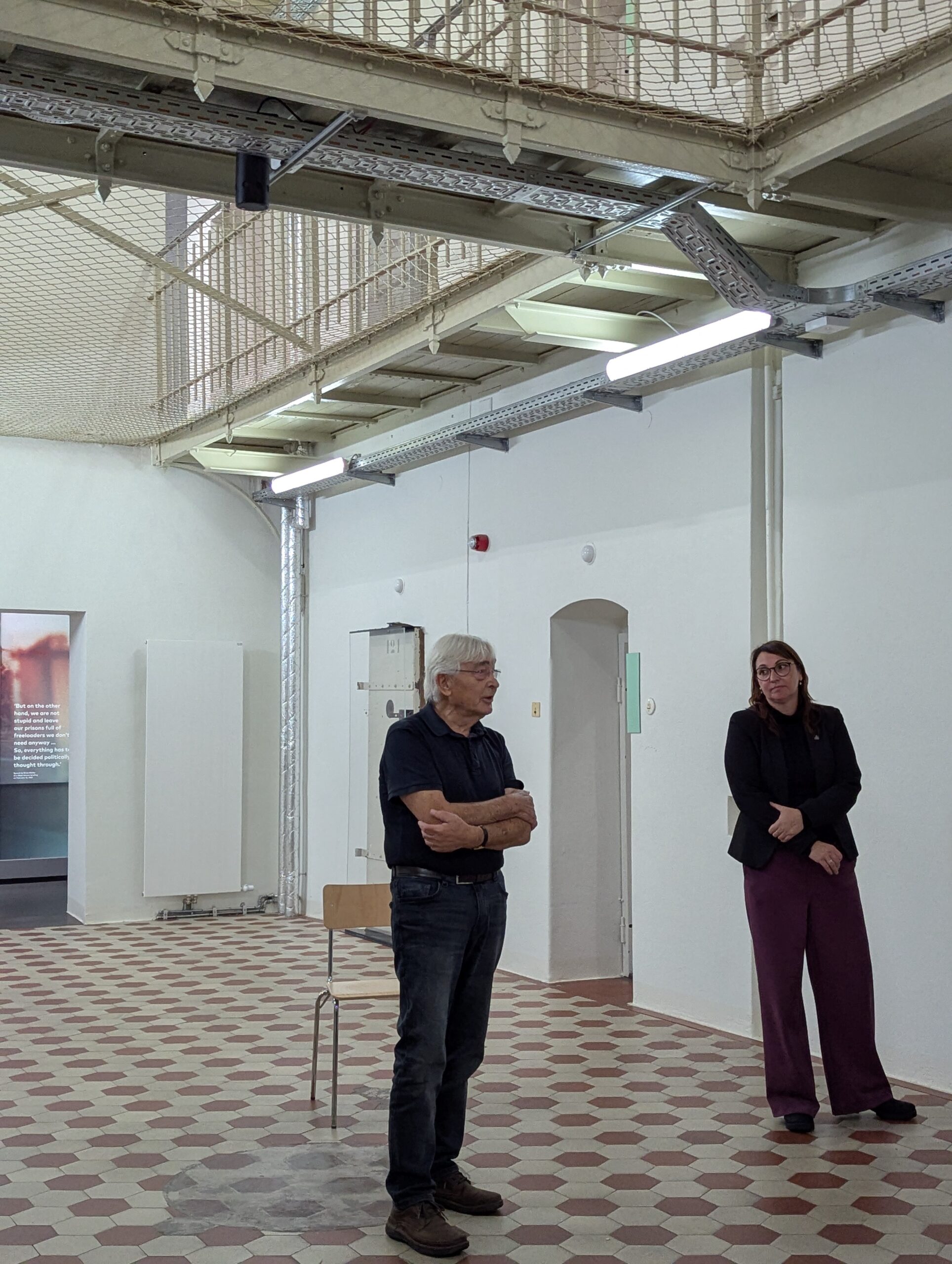Die Exkursion der VOS führte am 22. September nach Chemnitz zum Lern- und Gedenkort Kaßberg-Gefängnis. In den 1950er Jahren wurde das ursprünglich 1877 errichtete Gefängnis zur größten Untersuchungshaftanstalt des Staatssicherheitsdienstes in der DDR ausgebaut. Die Haftanstalt wurde zum zentralen Dreh- und Angelpunkt des Häftlingsfreikaufs aus der DDR, den mehr als 30.000 Personen durchlaufen haben. Vor Ort erhielten wir eine Führung von der wissenschaftlichen Leiterin Dr. Steffi Lehmann, die als besondere Ehrung für Zeitzeuge Wolfgang Bischoff ein Trio aus Streichern engagiert hat um die Kompositionen „Die Gedanken sind frei“ und „Ode an die Freude“ zu spielen. Alle Teilnehmer waren ob der bewegenden Darbietung am historischen Ort sehr bewegt. Im Anschluss berichtete Wolfgang Bischoff von dem persönlichen Schicksal von seinem Vater und ihm selbst. Der Vater wurde in den frühen 1950er Jahren verhaftet und in Chemnitz aufgrund von Spionagevorwürfen verurteilt. Die Familie hat ihn fortan nie wieder gesehen. Erst nach der Wiedervereinigung in den 1990er Jahren erfahren die Bischoffs, dass der Vater nach Moskau verschleppt und dort erschossen worden ist.