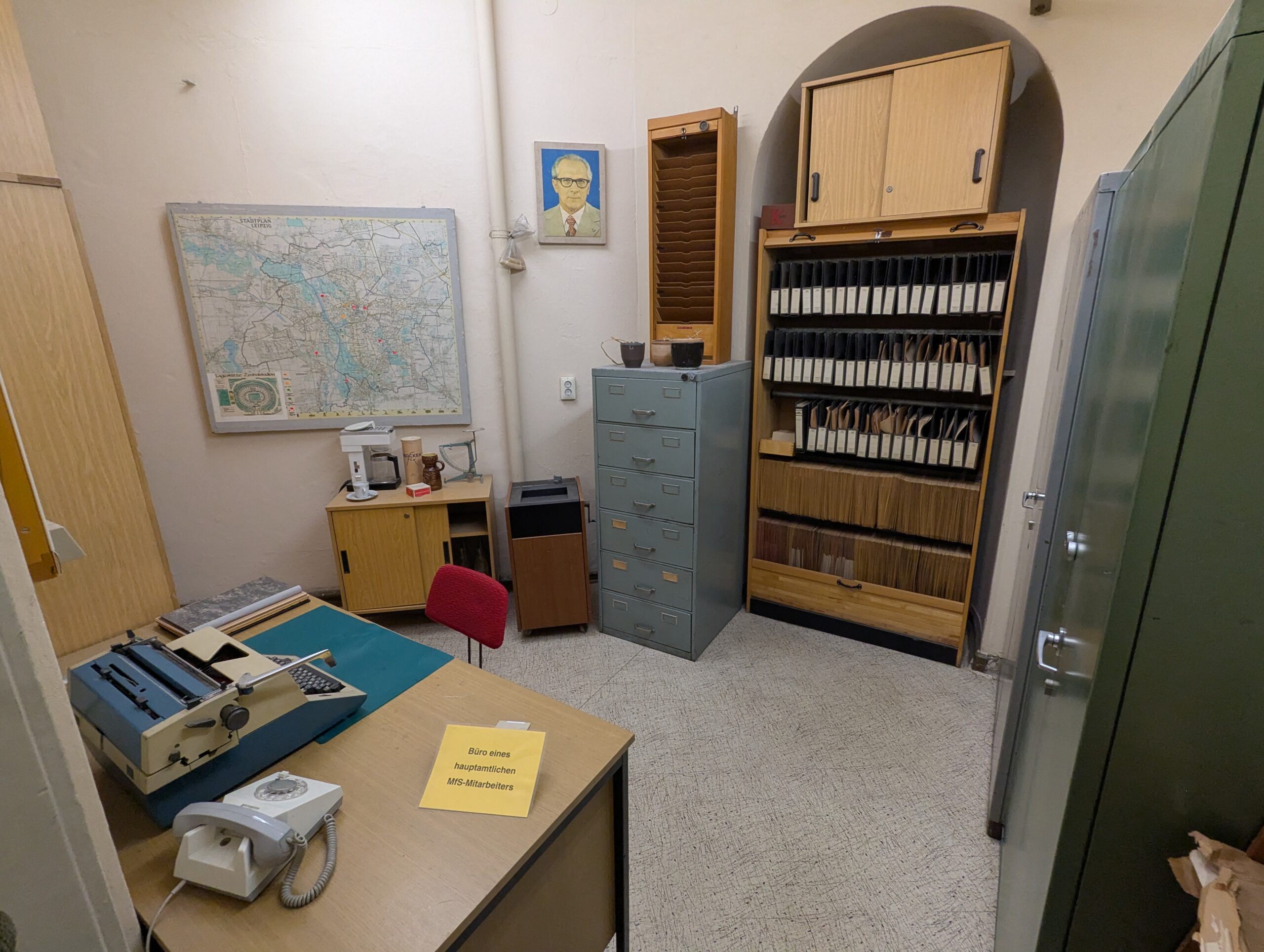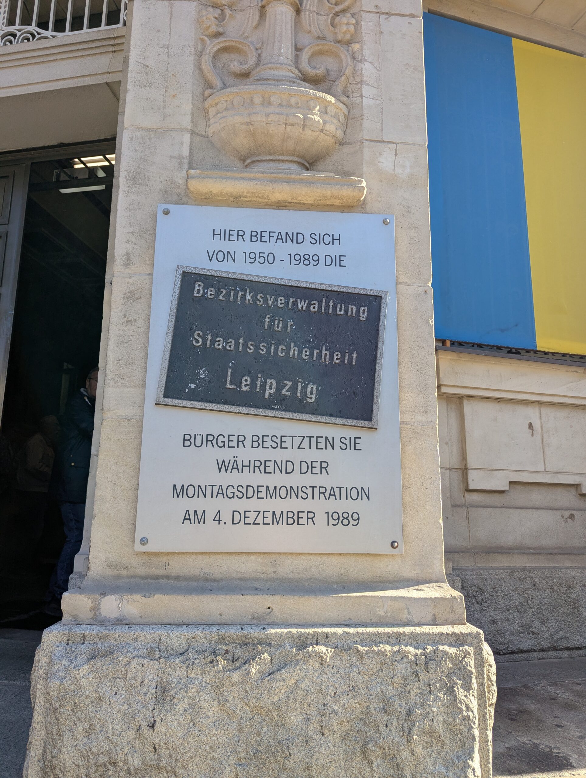 Am 23. September erhielten wir eine Führung in der Runden Ecke in Leipzig. Das sächsische Bürgerkomitee hatte 1989 die Bezirksverwaltung besetzt und die Aktenräume versiegelt. Heute ist dort eine kleine, aber dennoch umfangreich Ausstellung im Erdgeschoss zu besichtigen. Im gleichen Haus sitzt aus das Bundesarchiv mit dem Stasi-Unterlagen-Archiv Leipzig, bei der die Beantragung der Einsicht in die Stasi-Unterlagen möglich ist.